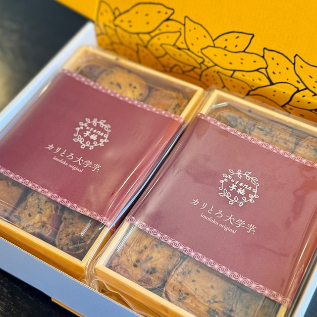 [3月中旬頃、販売再開予定です] ご注文後、2週間以内に発送いたします ※遅れが生じる場合は、メールでご連絡いたします。ご容赦くださいませ。 ◆商品内容◆ 芋福名物 カリとろ大学芋×2箱の≪ 冷凍便セット ≫ ▶︎日付指定はできません。(発送手続き完了後、配送業者様のお問い合わせ番号をメールでお知らせいたします) ▶︎発送日から商品到着までに、1~4日程度かかります ▶︎別途クール便送料がかかります ◆商品説明◆ 通常は生芋を揚げて作る大学芋。 約2時間半かけて焼き上げた熟成芋の焼き芋を使用することで、しっとりした食感に仕上げました。 外カリっ中とろっとの新食感大学芋は、芋福創業時から愛されている一番人気商品です。 ○賞味期限 冷凍保管(-18℃以下)で約60日 解凍後は、高温多湿を避け、当日中にお召し上がりください。 解凍方法は、同封いたします用紙をご参照ください。 ○原材料 国産さつまいも、みりん、粗糖、醤油、黒胡麻、食用油 ※当店では、うどん屋と同施設内で製造を行なっています。 施設内では、小麦、乳、卵、エビ、カニ、落花生、ナッツ類を使用しています ◆配送について◆ ○佐川急便の冷凍クール便で配送いたします。 ○離島の場合は、追加送料がかかります。発送方法を選択する際に[離島送料追加料金]をご選択ください。(ヤマトクール宅急便にて配送いたします) ※配送業者の都合上、一部お届けできない地域もございます。 ○時間指定の場合は、下記の7つの時間帯からお選びください。 配送業者様の都合上、時間指定ができない地域もございますので、あらかじめご了承ください。 ①午前中(8:00〜12:00) ②12:00〜14:00 ③14:00〜16:00 ④16:00〜18:00 ⑤18:00〜20:00 ⑥18:00〜21:00 ⑦19:00〜21:00 ◆ギフト包装について ◯お試しサイズのため、商品数に対し箱が大きめです。予めご了承くださいませ。 ○商品オプションよりご選択ください。 ○価格表記のあるチラシ等は同封しておりません。 ◯カリとろ大学芋等が入るサイズの紙袋を有料でお付けできます。(配送箱の中にお入れします)